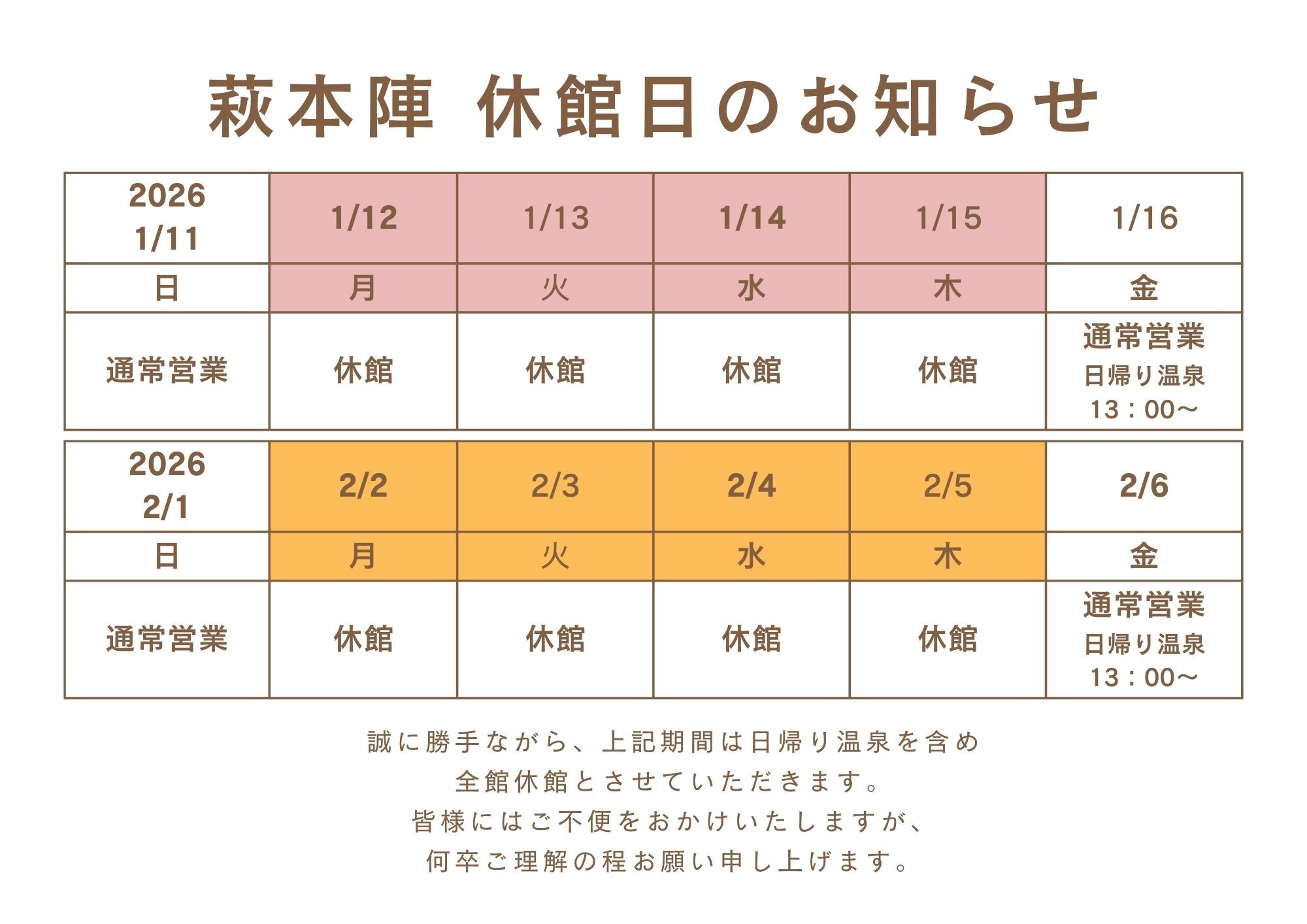期間中は 館内施設ならびに日帰り入浴もすべてお休み となります。